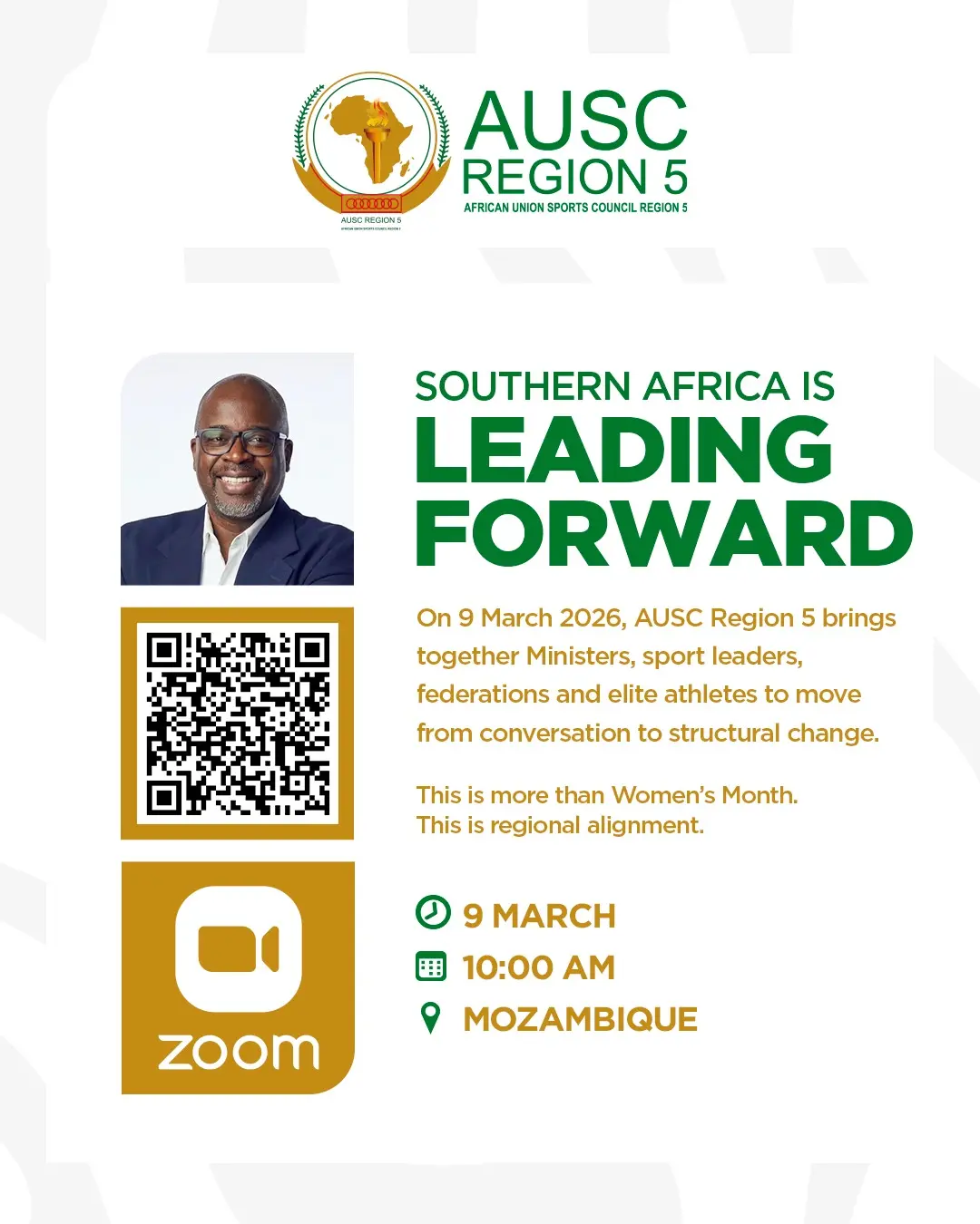 Women Leading Forward 2026 is a high-level regional platform convened by AUSC Region 5 to strengthen women’s leadership, governance and participation in sport.